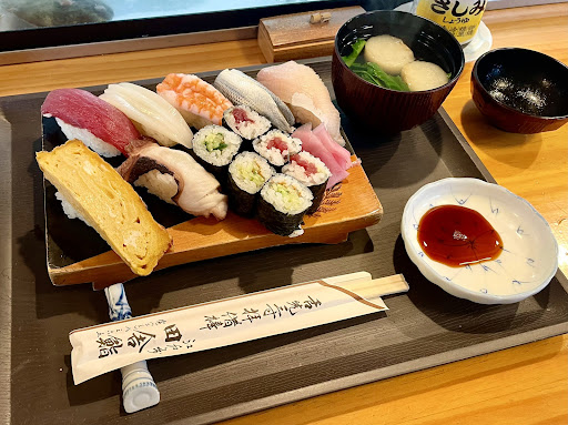 昼に入りました。前は木更津駅の近くに在った店らしいです。現在は駅から少し離れた場所で営業していらっしゃいます。 席はカウンター4。6人掛けテーブル1です。席は少なかったです。 水槽に車海老が泳いでいましたが、水がかなり濁っていたのが気になりました。 居酒屋の色合いが強い店の様ですね。昼はランチメニューが有りました。 ランチは《鉄火丼》1500円。《海鮮丼》1000円。《にぎり寿司》1000円です。にぎり寿司にしました。 値段から考えたら、かなりお得だと思います。もちろん最高のネタを使っている訳は無いですが、ランチの寿司としてのコスパは高いでしょう。 玉子はしっかりと店で焼いていて、甘過ぎない味付けでした。やや半熟気味で食感も良いですね。 鮪は筋が無い物で、粘りは無かったものの味も充分。ハマチかな?臭みも無くて美味しかったです。 海老は業務用の小さい開き海老で、此れは味気無い物でした。タコとイカは普通。 コハダは〆がキツくない塩梅で、ホンノリ生っぽい食感が好みでした。此れは美味。 気になったのが鉄火巻きです。鮪は握りと同じですが、海苔が違いました。張りが有って歯応えが良く、香りが立っています。かなり上質な海苔だと思ったので聞いたら、木更津の海苔との事。大抵の店は有明海の海苔を使いますが、此方の店は地元に拘っているみたいですね。たかが海苔と侮れないです。美味しい海苔でした。 お吸い物も良い出汁でした。 シャリが酢を配合したばかりで馴染みが浅かったですが、味の調整は好みでした。やや柔らか目。 ランチの寿司でこのコスパは、なかなか無いでしょうね。此れなら通常の御決まりも期待出来そうなので、次は御決まりで食べてみたいです...