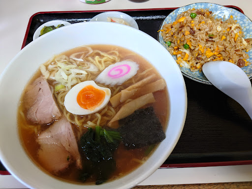 麺は、ぷりぷりつるつるの多加水の縮れ中太麺で、やや固め茹で。食い終わるまで一切ダレなかった。具は、脂身少なめながらしっとりやわらかなチャーシューが2きれ、ゆで卵半分、メンマ、ほうれん草、ネギ、海苔、そしてナルトという、基本の醤油ラーメンとしてはフルスペックの装備。 チャーハンは焼き飯タイプのしっとり仕様で、半チャーハンでもちゃんと炒めて作っておられましたね。卵の食感が柔らかくてよき。餃子は大振りですが、中国の水餃子みたいな分厚い皮ではなく、日本の大判の皮の餃子、という感じ。餡は野菜の食感がはっきりしていて、汁がだばだば出てくる。大きさの割にさらっと食べられます。