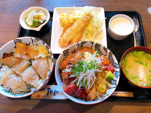土曜ランチで訪問。 雑居ビル1階で入口手前からポップな音楽がかかっていてクラブやバーみたいな感じ。 ??? 入店すると女性が元気に出迎えてくれる。 個室座敷か半個室テーブル席かを選ばせてくれて個室座敷を洗濯。 昨年オープンしたばかりで店内はとても綺麗で個室、半個室もオシャレで感染対策も良くされている感じ! ランチメニューも充実で何れも美味しそうで迷います😊 いいとこ取りミニ丼2種セットを注文。 ミニ丼2種は10種類から選択でき、 彩り海鮮ちらし丼とかぼすぶりの漬け丼を選択。 待つ事15分で配膳。 ご飯大盛りは無料。 ミニ丼茶碗とは言うものの大きめで大盛り2杯は男性でも充分な量。 ▪️彩り海鮮ちらし丼 →まぐろ、白身ぶりかな?、アボガド、などゴロゴロ入って白髪ネギ。ほんのり味付けがされていて、切り身も大粒たっぷりで新鮮美味しい。 ▪️かぼすぶりの漬け丼 →厚切りでご飯を覆っている。餌にカボスを入れて育てたブリらしく、口に入れた時にサッパリしたカボスの風味が口の中に広がったと思ったら遅れてブリの脂が口に広がる。旨し。 ▪️味フライ(半身) →衣サクサク、身はふわふわ。タルタルも付いていて嬉しい。うま〜い。 ▪️あら汁 →臭みは全くなく、あら出汁と味噌のバランスがバッチリ。熱々で旨い。 ▪️その他 →おしんこ、デザート(コーヒーゼリー) コーヒーゼリーのクリーム甘めでよく合います!