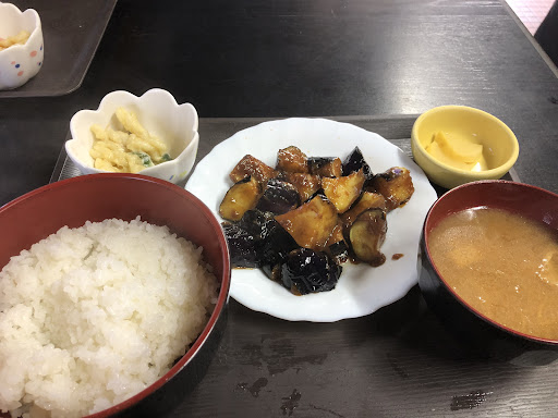 小鉢(なすのお浸し)と漬物、 ご飯、味噌汁が付いた定食。