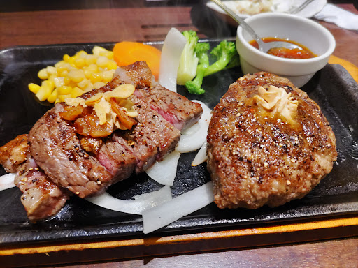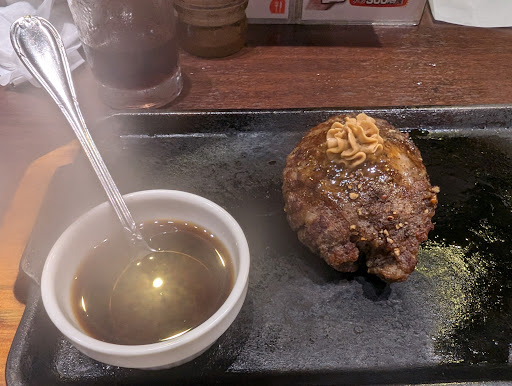 その後、追加のハンバーグを注文したが焼かれすぎていて鉄板に面してる側は焦げ付いて張り付いていた いつもは、ハンバーグも赤身の部分がありそれが美味かったが今回のお肉はハンバーグと言うよりも肉団子のように固まっていて、いきなりのハンバーグのジューシーさは全くなく 肉汁もそこまで感じられなかった
