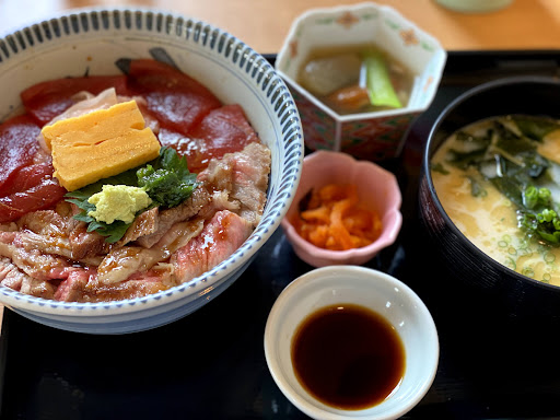 和牛とまぐろのWステーキ丼にミニラーメンを、連れは和牛とまぐろの二色丼にデザートをいただきました。 ご飯は酢飯か白米を選べますので好みに合わせて食べられます。