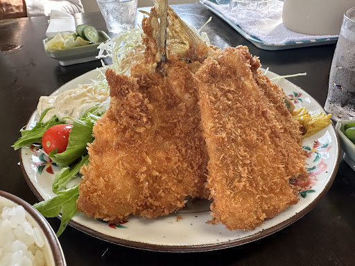 Read more平日の11:30ごろに入店。お客さんは1組だけ、駐車場?駐車スペース?も空いていました。 アジフライ定食を注文。アジが三尾でナイスボリュームです。 ご飯を大盛りにしてもらったら、真面目な大盛りでかなりの量。これはうれしいですね。 肝心のアジフライ、サクサクの薄付き衣に中はふわふわ、おいしいお手本のようなアジフライ。 3尾もあるから途中で飽きるかもなあ、、なんて愚考でした。アツアツのヤツを無心でかじり、余裕の完食です。 店内は、いつものおばちゃんに、いつものお客さんといった雰囲気で、めちゃまったりしてて居心地が良い。 最後に、お店前の駐車スペースについて。 多分ですが3台が限界、基本頭から突っ込む形になると思いますが、地面にラインなどはないので、後から来た車の停め方によっては出る時に狭くてちょっと大変かもしれません。 しかし最高。他にも色々メニューがあったので、今度は違うものを食べに伺いたいと思います...