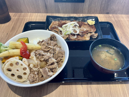 牛丼ON野菜 ¥677 大判豚肩ロース焼き皿(旨ダレ生姜) 単品 ¥534 味噌汁 ¥85