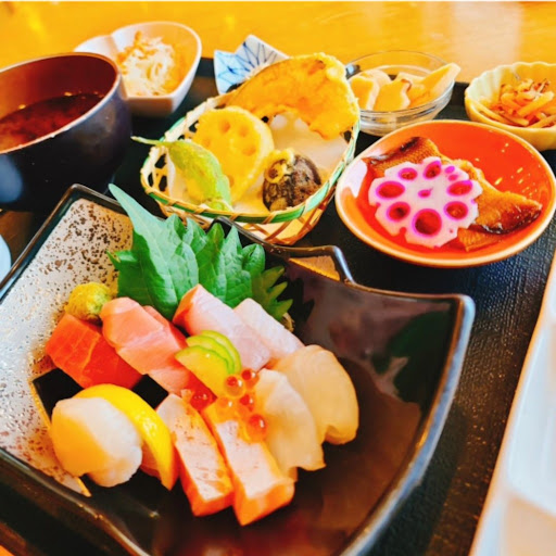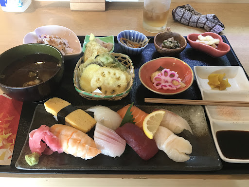 Read more寿司盛り膳をオーダー。 握り八貫 赤だし 天麩羅4品 鰤煮物 小鉢4鉢 野菜サラダ風