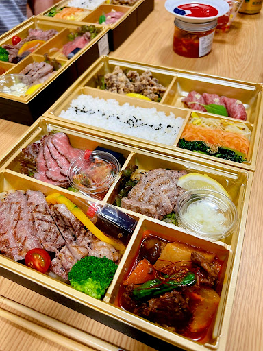 お品書きは付いていませんが、ローストビーフやステーキ、牛肉の煮込み料理からタンの揚げ物、さらには牛握りやピビンバ、キムチまで! お肉いっぱい、ご飯いっぱい!ついでに玉ねぎもいっぱい入った、とにかく美味しい御膳です!! ~~~