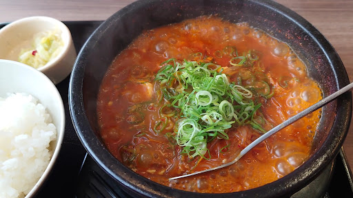 海鮮スンドゥブと焼肉丼(小)のお得セット990円を食べるつもりだったけどまだやってなかった。 それで牛すじ肉入りスン豆腐定食850円に変更。食券機の前で悩むと後ろに列ができるので😞💦焦る。 勝手に好きな席に座ってれば注文言わなくても順番が来たら呼び出される。フードコート並の音量で。 自分で取りに行って自分で食器を返すから確かにフードコートか。 スタッフ1人位フロアーにいて店のシステムを説明したりしてもいいのに。始めての人は料理受け渡し口で、つまり別のお客様の料理の上で質問してるし、空いたテーブルをアルコールで拭くことなく次のお客様が座る。 スジ肉は硬かったけどアサリやキノコもちょっ...
