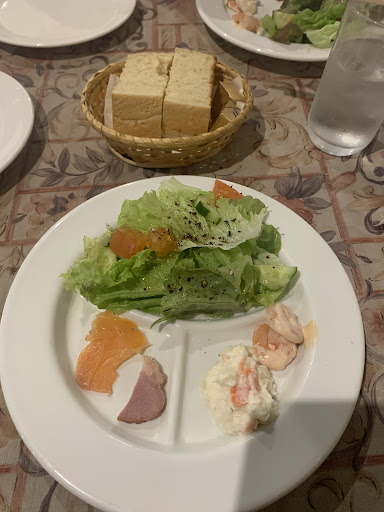 ◎アンティパスト サラダの他にスモークサーモン、ベーコン、ポテトサラダ、小海老のオーロラソース?が乗っている。色んなお味が少しずつ楽しめて嬉しい。