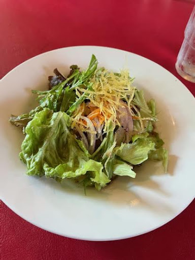 最初のサラダ、ライス的にフランスパンが、出てくるとき普通だったらバターらしきものであるが、