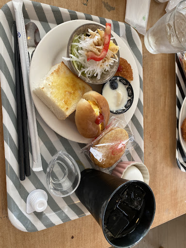 メニューは机になく店内にも掲示してないのでホットコーヒーを注文 値段が分からない😅 後からホットよりアイスの方がちょっと高いと聞きました あとゆで玉子か茶碗蒸しか選べるようです