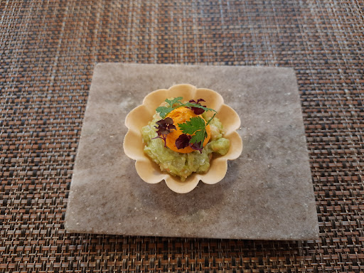 アミューズは春キャベツとほぐした蟹に カレーマヨとトマトマヨがかかってて絶品! 春巻きの皮で作られた受け皿が パリパリ食感でめっちゃ美味しい✨