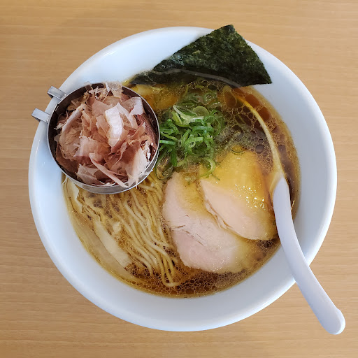 10分足らずで鰹節の上品な香りたつ中華そばが着丼 丼の内側に小さなフルイ?裏ごし器?のような器具がついていて中に鰹節が…「こちらにスープを追いがけしてお楽しみ下さい」と説明あり 先ずは澄んだスープを追いがけなしで一口…鰹の旨みから鶏の旨みが後から広がります 最初、濃いかなと感じましたが麺や具材と馴染んでマイルドな味わいになります 麺は中細ストレート麺でツルツル!程よい弾力もあって茹で加減はGOOD チャーシューは豚と鶏のW!スープを風味を生かす控えめな味付け 穂先メンマは柔らかでトロけるようなような食感 一通り味わい、追い鰹…鰹の風味が増すのはもちろん深みもUP!残った鰹節はネギたまご飯に乗せていただきました♪ ※追い鰹の後、器具を外して置ける小皿があるとうれしいです