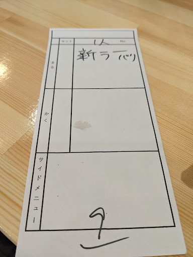 2021.12.13.(12:50)頃来店。月曜日は開いてる店が少ないので、助かりました。 店内は綺麗で今時の感じにスッキリまとまっています。 注文は席についてからで、、、、新味 注文しましたよ。硬さは、バリカタ。 程なく、着丼。見た目キレイ。 ス―プはあっさり、けれどしっかりとんこつ。 とりあえずごま投入、からの高菜、紅生姜、そしてにんにく。 整いました、、、が、バリカタ麺が浮いたな^^; 次回は カク で、ねぎばっかに...