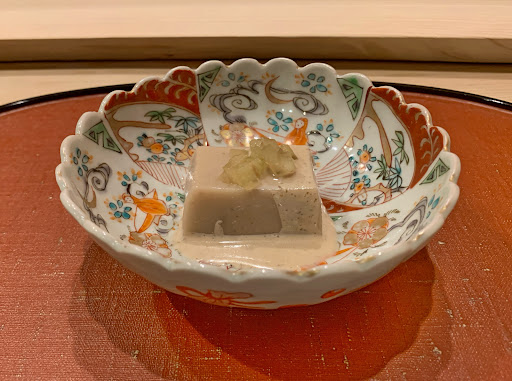 🟩お任せコース (11,000円 税込+サ) ・胡桃豆腐 ブドウ・天晴(あっぱれ)添え 胡桃の味わいを活かす上で胡麻を加えているそうです。 タレは胡麻ダレです。 葡萄のアクセントが印象的。 ・湯葉のしんじょ、ホウキダケの椀 ・鰹のたたき ・鰆、わかさぎの煮物、さつまいものレモン煮、カラスミ ・ふたご里芋の揚げ物、茹で落花生、新生姜のガリ ・飛龍頭、牡蠣の焚き合わせ ・アミタケ、天然シメジ、ナラタケ、鶏の雑炊 ・ポポのアイスクリーム ポポ旨いんです!