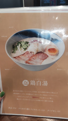 今回は連れと共に泡鶏白湯と泡味噌鶏白湯をそれぞれダイブめしセットで。提供時間はほどほど。待ってる間に食べ方指南の札が置かれます。紙エプロンももらえますので、淡い色の服の方は貰った方がいいです。濃厚スープは跳ねやすいです。
