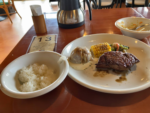 Read more午後3時過ぎというハンパな時間にランチできる店を探して彷徨い、ここに辿り着きました。おまかせステーキ200g以上にサラダ・スープ・ライスバーを付けて大正解でした。ミスジとハラミをレアで。ワサビが良く合って最高。そして、ご飯が美味しいです。ライス食べ放題でこんなに粒立ってツヤツヤのご飯には昨今なかなか出会えません。また、スープバーの「お肉屋さんのトマトスープ」もさっぱりしているのに深みがあり、おかわりして頂きました。サラダバーは…サラダは…良いじゃ無いですか!ミニトマトが山盛り。ゆでオクラもある。謎のカクテキ的な何かも美味しい。十分です。付け合わせの野菜もあるし。うん。また、メニューにデザート系がほとんど無いのも潔くて良い。肉と飯を喰らいに行くところですよここは。そして1番の推しポイントは店員さんではないでしょうか。「こんな人にお肉を焼いて貰いたい」と誰もが想像する様な方がお肉のケースの奥で微笑んでいます。平日ランチですとお得ですし、夜もお酒と楽しみたい。必ずまた食べに行きます。自分の家か...