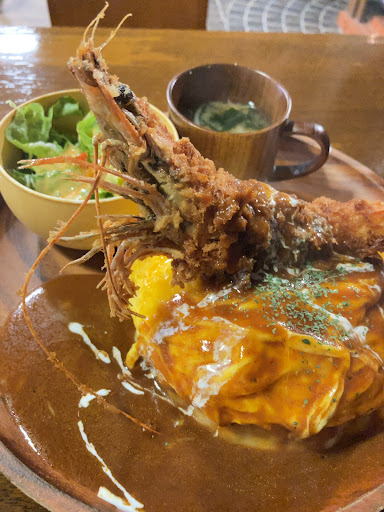 大きい道から少し外れた場所。住宅地の中にあるお店です。駐車場が少し狭くそんなに台数が入らないので注意が必要です。 裏に臨時駐車場があるようなので、詳しくは、お店の前に貼ってあるので見てみるといいとおもいます。 店内は、テーブル席が、15席ほどあり広い印象がありました。駐車場は混んでいたとしても、店内は広いので、すぐテーブルに案内されると思います。 薄暗い店内で、モダンなレトロな雰囲気でとても良かったです。 「海老フライ」がここのオススメで、大きいエビが丸ごと出てくるので、太くて身がプリプリのエビフライが食べれます。すごく美味しいのでぜひ食べていただきたいです。 一品料理にもあるので、違うメニュー頼んだとして食べれます。 メニューは、ラーメンからオムライス、パスタ、定食メニューなど幅広いメニューがあります。メニューは写真とコメントつきで、選びやすかったです。選ぶのに困りました。 オムライスいただきましたが、卵がトロトロですごく美味しかったです。 量も、ちょうどよかったです。オムライスと一緒にサラダと味噌汁もついてきましたが、オムライスに味噌汁という組み合わせが個人的によかったです。 デザートなども豊富にありました。 プリンをいただきましたが、カラメルの変わりにメイプルシロップが使われていて美味しかったです。卵の味がつよく濃厚なプリンでした。 味だけでなく目でも楽しめるので、次もぜひいってみたいと感じました。 会計の横にドライフラ...