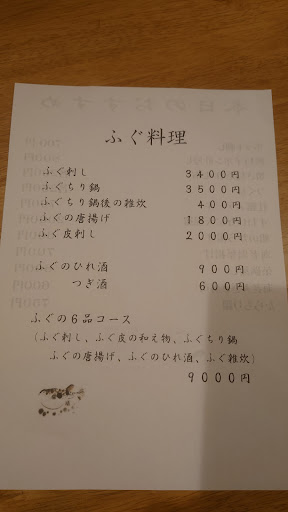 Read more目的のお店が当日予約不可でこちらに初訪問。 席に着いて、飲み物を注文。そして飲み終わる頃にお通しが到着。 注文したメニューもなかなか来なかった為に、キャンセルして退席しました。 こちらのホームページを見て、ふぐの料理が豊富そうなので、期待していましたが、 メニュー表を見ると、ふぐ焼きしかなかった。 隣の団体さんが結構騒いたり、カウンターのお酒のボトルの並べ方・音楽の選定など、料亭なのか、入りやすい居酒屋なのかポイントがわかりずらい店という印象。 帰り際、女将さんがサービスの料理を出してくれたり、会計時に謝罪してくれたので、 私自身は嫌な思いはありません。 前もった予約をしていない一見ですし、 たまたま込み合っていたのかもしれません。 ただ、料理の提供が遅くなるのであれば 入店時に教えてほしかったですし、お通しぐらいは最低限先に提供するべきです。 それを先に行わないのが、意図的であればもちろん論外ですが、気配りが出来なかったのであれば、お店の経営をしている人間のレベルの低さがそのまま表れている。 個人的に次利用す...