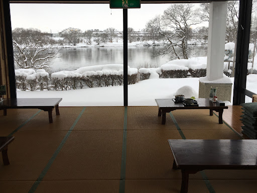 The first thing you come across when you walk into the rest house is a gift shop filled with snacks, crafts, and souvenirs that are either made in the area or are characteristic to the Iwate and Kitakami area. If you walk through the gift shop you get to a restaurant with tables and chairs and a large tatami area further in the back. Big windows overlooking the Kitakami River line the walls. You can't see the cherry trees but the view of the river is superb. To order food or drinks you have to first stop by the cashier in the gift shop and order from the menu there and get a ticket to bring...