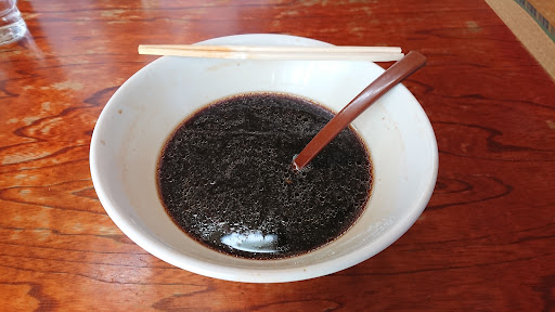漆黒ラーメンは、おお〜マジで黒い!背脂トッピングのため、見た目は黒くないですが、レンゲでスープをすくってみると、マジ黒い!富山ブラック、郡山ブラックよりも黒い感じがしましたね! スープを飲むと、しょっぱくない😁飲みやすい。節系の出汁をしっかりとってある感じがしました。喜多方ラーメンですね。そんで黒い!喜多方ブラックラーメンって感じです🤗 麺は中太縮、少し軟らか目とのレビューだったので、麺硬にして正解でした。自分的にはもう少し麺硬でもよかったかな。