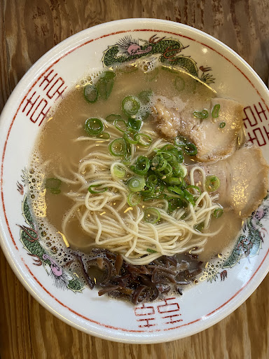 駐車場は大通りからみて店舗左にある。おおよそ9台。(うち一番奥角は店員さんのものと思われ、実質8台) 前面の大通りは中央分離帯があり、反対車線からは入れず、Uターンしなければならない。 店舗中はカウンターがあり、右奥にテーブル席が2つある。 券売機は無く、食後にレジで支払いをする後払い制。 この日はラーメン&Aセット(1040円) にした。千円を越えるが、Aセットは唐揚げ3個とおにぎり2個という内容で、結構お得。 ラーメンはわずかに泡立っていて、ほんのり甘味もありマイルド。麺は極細とまではいかないが結構細い方でした。茹で具合を聞かれて「カタ」で頼みましたが、歯ごたえがあり、美味しかったです(*゚ー゚) 具はキクラゲと青ネギ、やや小振りなチャーシュー2枚。卓上にはゴマや替え玉時のラーメン醤油、高菜がありました。今日座った席からは残念ながら厨房の様子は分かりにくく、次回は厨房が良く見える場所に陣取りたいですね。 スープは当初豚骨あるあるなアンモニア臭が少しだけするも、それは本格的な豚骨スープである証。口馴染みが大変よく、旨味がフワッと広がり、塩気も優し目。スープを飲み干してみると、底に溜まるものがなく、丁寧に濾してあるようだ。 途中、唐揚げとおにぎりと豚骨スープとを一緒に頬張ってみたが、そこには見たことのない景色が広がっていた。 ちょっと言えば中華風なアジアの光景。味変を楽しみながら堪能できたので、1040円は十分価値はあった。 店内に店員さんは3名(うち1人が店長かオーナーと思われる)いた。 他の家族連れが会計してるとき、子供に飴をサービスしていて、子供がお礼を言うと、店員さん(店長か、オーナーか)がニッコリしていたのが印象的だった。 いいラーメン屋さんに出...