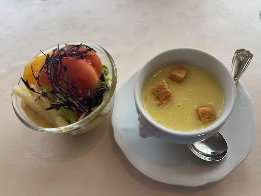Read more昔からお店の評判は良く、知っていましたが、なかなか行く機会がありませんでした。 今回は検診帰りに友人とランチに♪ 開店はネットでは11時半からとありましたが、当日電話で席の予約をしようとすると、12時〜との事でした 無事に予約もでき、12時に入店♪ ランチコースの中から、小さめサラダの方に、デザートとドリンクを付けてお願いしました。 程なく、コーンスープとサラダがきましたが、小さめと説明があったサラダのボリュームにまず良い意味で驚きました笑 トマトやリンゴも入っていて、ドレッシングもお味がよくとても食べ応えのあるサラダに、コーンスープも甘く美味しかったです。 メインのお肉料理も、厚みのある豚肉のソテーに付け合わせのお野菜には菜の花もありコクのあるソースを絡めて食べるととても美味しく、セットのもちっとしたパンもソースを付けて味わい大変な満足感でした✨ デザートも、しっとりしたチョコケーキに、アイス、ゴロっと大きめなリンゴとキウイがついていて、お料理はどれも全体的にボリュームがあってお得感がありました✨