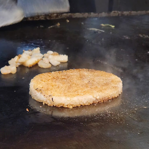 そしてダークホースだったのが焼きごはん‼️ 焼きごはんって何⁉️店内でわらじ型のごはんの写真をみて、これはなんだろう?という興味から注文✨ これが、予想を上回る美味しさで、焼きおにぎり以上の芳ばしさもあり、薄型なので食べやすく、そして焼いたエビとイカのおかげで味にバラエティー感があります。