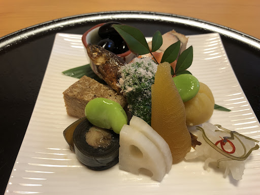 先付け お正月 なます、黒豆、昆布締め、栗きんとん、たづくり、かずのこ、エビ、ほうれん草のお浸し桜でんぶ、羽子板をかたどった鳥のそぼろ寄せ 春の食材そら豆 それぞれ丁寧なお仕事。