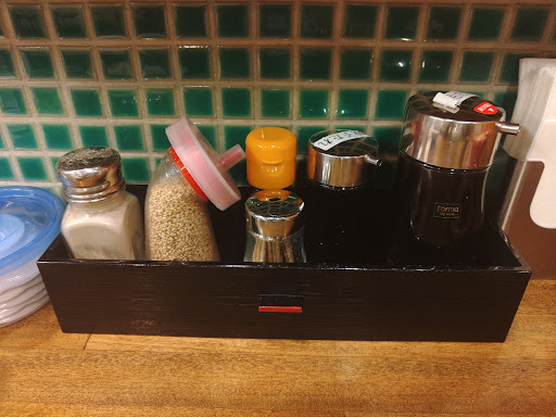 店舗前に他店との共同駐車場あり。 恐らく停めるのには困らない。 箱はURの物件。1階路面店。 入り口入ってすぐ左に食券の券売機あり。前払い式。 お冷やはセルフ。席はカウンターが約6席、テーブルは4人掛けが3つ程。 平日夜19時頃訪問。当初お客さんは居なかったが、すぐ大学生らしき4人1組と、個人客が2組来ていっぱいに。 ちなみに学生は学割サービスがあり、普通のラーメンだと、50円割り引かれる模様。 この日は、「もやたまラーメン」&「小ライス」を注文。合計800円。価格帯は普通。 始めに寸胴からラーメンどんぶりに スープを注いでおき、麺を湯がくのだが、湯切りは豪快で麺が宙に舞う程。空気に晒して冷やすことで締めている。湯で時間の管理も大事だが、これによりあの麺の歯ごたえを出すのだろう。 スープも乳化がうまくいってて、麺に馴染んで旨い。一連の流れ作業は無駄なく美しさすら感じる。 ご飯をよそって提供するのはアルバイトに担当させていて、分業することで効率化を図っていた。 ライスの量はこんなもんだろう。平均的だと思う。 もやたまラーメンは多分、モヤシとゆで卵のラーメンの略で、モヤシとゆで卵の他にキクラゲと青ネギ、大きなチャーシュー2枚が入っていた。ゴマは提供される前に降ってあるが、各々の卓上にもおいてあるので好みで更に降ることもできる。 あと、お冷やの横に紅生姜が置いてあった。辛子高菜はない。 ひとつだけマイナス点を指摘するなら、半月に切られたゆで卵が冷たかった事。温かいスープを頂き、麺をすすって、卵に行った時、卵だけが冷たいのは、全体の調和を乱してしまう。 だが、それでも旨かったので90点位か。よって星5つ...