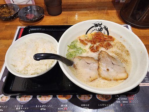 【ランチメニュー充実のファミリー向けラーメン店】 まさに「ザ・無難」といった感じのラーメン。老若男女誰が食べても8割程度が「普通に美味しい」と言われるレベルかな、と。 でも、それがどれだけ大変な事か、ラーメン店に限らず飲食店で働いた事のある人なら判る筈。 肝心のラーメンですが、注文時にニンニクの有無を聞いてくれ、私は入れましたが、入れなかったら更に無難なラーメンですね。 メンマ好きの私はメンマラーメンを探しましたがメニューにはピリ辛メンマラーメンしか無く、仕方なく注文しましたが、トッピングには普通のメンマが書いてある!ここだけは少し不親切だなと感じました。福岡の中では中太に分類されるストレート麺は、プツッとした歯切れで美味しかったです。スープはピリ辛とニンニクのお蔭で中々のパンチでした。ピリ辛・紅ショウガ・辛子高菜はセルフで取って後入れも出来るのは嬉しいです。 とにかくランチのメニュー、組み合わせが多いので楽しみに来られるお客さんも多いと思います。 接客も無難でしたが、注文の品を持ってきた際と、替え玉を持ってきた際の従業員さんの手が水でビチャビチャだった...