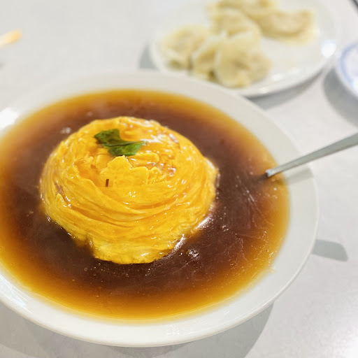 天津飯は見た目より、結構たっぷりご飯が盛ってあり、ドレープドレスのように焼き上がった卵の下には、エビとカニが少し乗ってました。 薄味好みの私には、ちょっと餡が甘めで濃いめでしたが美味しく食べられました。 水餃子はぷるぷるもちっとして美味しかったです。 本場中国では、前日食べた残りの水餃子をフライパンで焼いて焼き餃子にすると聞いた事がありますが、こちらもそんな風なスタイルの食感を感じました。 焼き餃子なのに、プルっもちっとしていました。 相席のお向かいのご夫婦は餃子は酢胡椒で食べられていました。