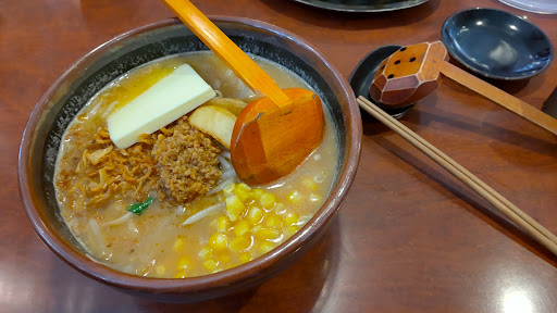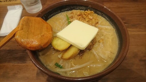 味噌ラーメンで有名な「麺屋 田所商店」から暖簾分けで出来たお店です。暖簾分けなのでメニューも田所商店と同じです。 経営方法が違うのかな? それはさておき、北九州で味噌ラーメンは数少ないので貴重です。分家すると味が変わってしまう悪例(山○屋とか)があるけど、此方のお店はキチンと本家の味を引き継いでますね。 超バターラーメン大盛りにコーントッピングを頼みました。 ピークを過ぎた時間だったので空いていました。食券性ではないので着席してからオーダーを取りに来ます。お冷やもスタッフが持って来てくれます。 ラーメンには肉味噌、モヤシ、フライドポテト、コーン(トッピング無しでも)、フライドオニオン、バターの角切りが乗っています。麺は中太の縮れ麺なのでスープが程よく絡みます。 濃厚味噌である北海道ラーメンが良い感じです。見た目に反して割りとあっさり(トッピングのバターを除くと)しているので、大盛りでも難なく食べる事が出来ます。また含水率が多い麺の様で、時間経過しても余り柔らかくならないのも良い所。 非常に美味しいラーメンです。 難点は少々お高い事かな(楽に¥1000円超えます...) 。 接客も元気が良く、丁寧です。 駐車場だけか少々難ありで、国道10号の上り側からしかアプローチ出来ません。他の道、向きからではUターンしなければならないのですが、交通量が非常に...