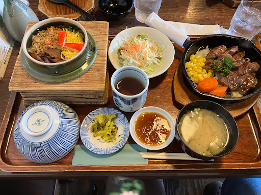 菩提樹さんの看板メニューは釜飯です。 なので、五目釜飯と赤身熟成牛ステーキセットにしました。 釜飯は、お茶碗2膳ほどあり椎茸の旨味がお米にもあり美味しかったです。 熟成肉も柔らかくて美味しかったですしソース(ジャポネソース??)もお肉に良くあっていました。