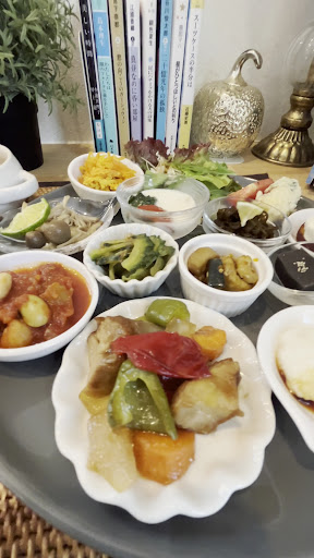 土曜日に、限定日替わりランチプレートが食べたくて、お昼前に来店しました。入店時、飲食スペース手前で靴を脱ぎます。 注文する時に、一緒にCセットのドリンクと選べるデザートセットをお願いしましたが、量が多いですよと優しく言われ、Bセットのドリンクとミニデザートにしました。 運ばれてきた日替わりランチプレートは、大きなお皿に12種類の色とりどりの小鉢が隙間なく並んでいました。Bセットのコーヒーは、この日はグァテマラで、ミニデザートの濃厚なアイスまで全部美味しくいただきました。メニューに小さく書かれていたCセットの4種のデザートプレートがとても気になるので、いつかたずねてみようと思います、
