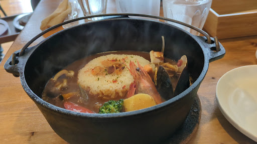 Read moreカレーがおいしい落ち着いた雰囲気のカフェです。 門司港と言えば焼きカレーで、オーブンで焼くものだと思っていましたが、こちらのカレーは最後にダッチオーブンで焼き上げて香りを立てるタイプです。 おいしいです。 私はシーフードカレー、主人は牛筋カレーをいただきました。アツアツのダッチオーブンにごはんと具が入った状態でワゴンで運ばれてきて、お店の人が目の前でカレーソースを注ぎ込んでくれます。じゅっという音と共に、スパイスとシーフード(または牛肉の)の香りが立ち上って食欲をそそられます。色とりどりの野菜たっぷりでめっちゃ映えます。が、見掛け倒しではなく大人が食べてちゃんとおいしいです。 すべての具がちょうどいい火の通り具合で、エビや野菜の食感も楽しめました。スパイスの香りは強めですが、刺激はなく、辛いものが苦手な人でもおいしくいただけます。逆にカレーは辛いほど正義だと思っている人にはお勧めできません。酒飲みならビールが欲しくなる味です。