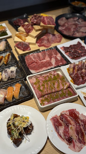 100種類以上の食べ放題!! 極上寿司と焼き肉どちらも食べられる😋 炙りのどぐろ!本鮪の中とろ!大赤海老! 真ふぐ!サーモンのトリュフバター炙り! かに身とかに味噌のW軍艦! はみ出る天然海老フライ巻き! 毎月かわる目の前で炙ってくれる5貫盛り! 小学生未満は無料小学生半額家族連れには嬉しい🤍 焼肉は仕入れにこだわった厳選素材 肉のプロが店内でカットしてるよ。 寿司は注文が入ってから握る出来たてを提供。 豊富な冷麺やビビンバ逸品料理やデザート メニュー数は最大115種類以上♪ 取りに行かなくて良いから席でゆっくり オーダーバイキング120分お楽しめる!