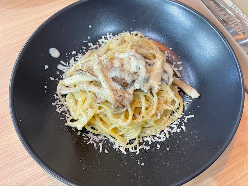 メニューはきのこのクリームソーススパゲッティを注文! とても濃厚できのこの風味も良く、美味しかったです😍 注文の際に、「お子様はどうされますか?」と聞かれ、食事中に預かってもらったり、食後に少し預かってもらったりもできるようでした✨ その日は特に子供もグズグズしてなかったので、そのまま席に座らせていましたが、たまーに眠くて泣いちゃったりする時があるので、そういう時はとても助かります😊 保育も人数制限があるので、毎回預かってもらえるわけではなさそうです。 その日はたまたま空いていましたが、出来たら予約された方が良いと思います🤔
