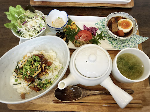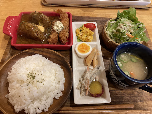 Read more店長のきまぐれランチをお願いしました。この品数で1300円です!魚が好きと言うと、メインがぷりぷりアジフライで、とても美味しかったです。ひじきやオクラの和物など、全部家庭的で美味しくて一つ一つがとても丁寧。 小さな子供さん同席ファミリー向けのスペースがあり、静かに食事が出来きたのでこれは最高に嬉しい!! 建物自体が新しくはないけど店内は綺麗に片付けられていて綺麗でした。 店員さんもニコニコしてて可愛らしい。 支払いの時に一緒に来た友人が美味しかったーと言うとオーナーさんらしき男性もニッコリしてくれてた。 デザートの写真は撮ってないけど、コーヒーカップがビンテージでオシャレでした。楽しく過ごせました。ご馳走...