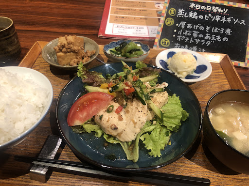 Read more宇佐町の裏通りにある隠れた名店。 場所がわかりにくく、コスモス薬局宇佐町店の裏手にひっそりとあります。 入り口はこじんまりとしてますが、中にはいると別空間。おしゃれな店内と奥にはおしゃれな雑貨がたくさん広がります。 メニューは少なめですが、日替わり定食を頼めば十分です。 素材の味を活かした野菜の小鉢3品にメイン。それととってもおいしい味噌汁がついてきます。 夕食で利用させていただきましたが、昼はランチやカフェとして、オードブルのみの仕出しなんかもやっており、ほんとにいろんな場面で...