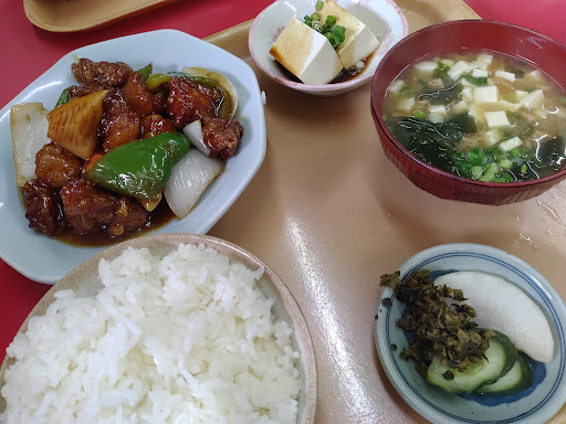 酢豚は甘辛くて塩加減も濃いめで好み。お味噌の具も、ワカメ、豆腐、油揚げが煮物並みにぎっしり。小鉢にお豆腐。漬物もあり。 お水はセルフサービスですけど、コップがワンカップの空き瓶なところが昭和的で良き。