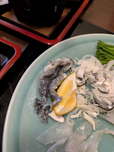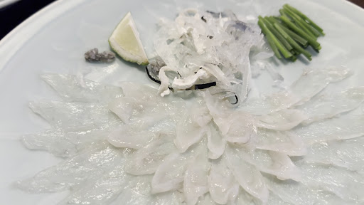 Pufferfish sashimi & hot pots, plus meat, vegetables & other seafood in a relaxed setting.