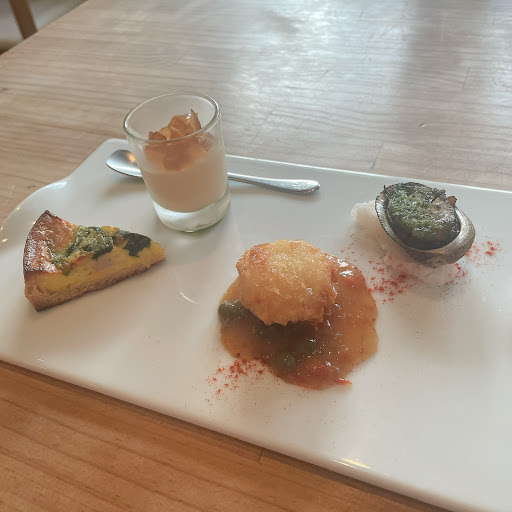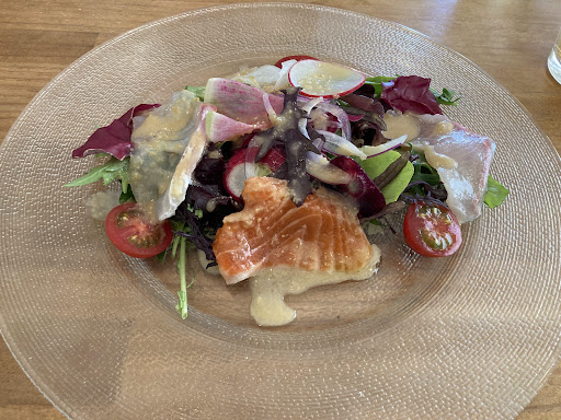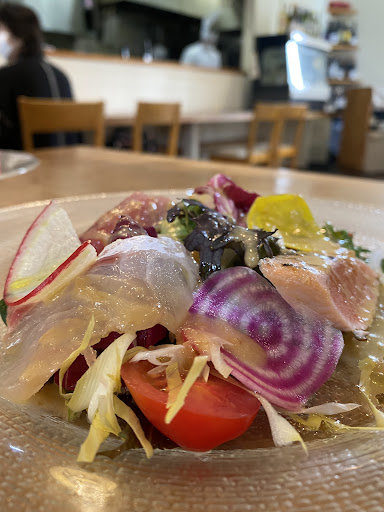 お昼を食べようと、ググってみたら、こちらのお店がHITしました。。。口コミも、割と、高いので、行ってみることにしました。入り口が、少しわかり辛いので!説明しておきますね。手前の一階は、お花屋さんと、ガーデニング用品で、敷地内の、1番奥の、階段を上がって、左手が、お店です。右手は、サロンとなっております。。。お料理は、割と、シンプルながらに、センスあるいい感じの物です。素材を大切にしたお料理のように感じました。今日、初めて行きましたが、サラダのドレッシングとか、お魚や、お肉のソースは、メッチャ美味しかったです。パンも美味しかったし、パンに付けるバターが2種と、玉葱の煮詰めた物の、計3種があり、それぞれが、美味しかったです、、脂っこいお肉が、嫌いだから、相談したら、キチンと、提案してくれ、私の好みにして下さる配慮も、有り難かったです。店内は、コロナ対策も、考えられていて、ナイスでした。店内は、白を基調とした、モダンな作りで、オープンキッチンです。お冷ではなく、暖かいお茶が出たのは、私的には、嬉しかったなぁー。きっと、このお店の奥様の提案でしょうね。あと、店内の音が、割とよく響くのには、少し、戸惑いました。。。3つ先のテーブルのお客さんが、話していた内容が、聞こえてきたので、それもちょっと、挟み込みますね。その、お客さんが言うには、キッシュを、テイクアウトしたら、凄く、美味しかったよって。。。なる程。。。今日は、キッシュは、食べてないけど、ふんふん。。。なるなる。。。あと、今は、コロナの為、電話予約制になっているみたいです。行かれる前に...