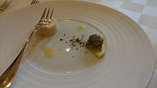 アミューズ:柔らかいスフレみたいなのと砂肝 スフレみたいなのは貝系のものでした。砂肝はびっくりするくらい柔らかく仕上げてあっておいしかったです。