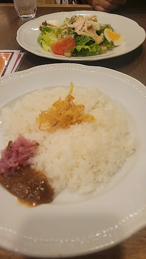 ライスの付け合せについていたフライドオニオンは、香りや風味は感じず、とろっとしたジャムのようなペーストは、私には甘すぎて、二口ほどカレーと食べてみましたが、あまり好みではありませんでした。 ピンクの漬物は、少し酸っぱくて食べやすかったです。