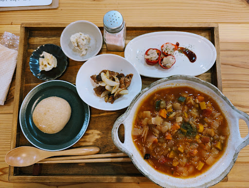 Read more平日訪問。いつか来てみたいとずっと思っていました!ここかな?って感じで一度、通り過ぎてしまいました。🅿️は、無いので、近隣に停めます。(すぐ近くにあります。) 入り口から、雰囲気良さげ。店内に入ると私好みの雰囲気😍しかもキッズスペースまであり。『Hyggeランチ』10食限定を注文します。 はじめに白湯をいただけるのも嬉しい♪雑穀米や野菜たっぷりのスープ🩷女性大好きですよね。身体がほんと喜ぶメニューですね。小鉢も丁寧に説明してくださって、ほんとこだわりを感じました。とっても美味しいです〜☺️ 味の調整で良かったらとお塩🧂まで、用意してくださいます。…が、全然使わなかったです!(めちゃ塩好きなんですが。)お料理も上品で、早食いのわたしも😅なんだか、上品にゆっくり味わっていただきました🤗友人同士、子連れ、1人でも来れそうですね。オーナーさんのお人柄もとても良かったです🤭 腸活しにまたきます�...