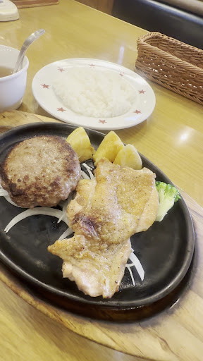 E: Satisfied points. ➀ Inexpensive. You can eat both sufficient amount of steak or hamburger from ¥1,000. In addition, you can order rice, bread and soup as much as you want. Perfect !