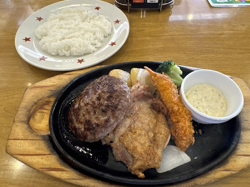 J: 先ず“良かった”点を申し上げます。 ➀「安価にステーキ・ハンバーグを楽しめる」 ¥1,000前後で食べれて、ライスorパンそして日替りスープは食放題!