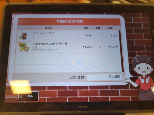 『すき家』でよくある店舗設計ですね。出入口左手にお手洗い、出入口前にレジカウンター、反時計回りにカウンター席と外側にテーブル席がある…というスタイルです。 イートイン客はタブレット端末で注文するほか、テイクアウト客もセルフ注文する端末が設置されています。
