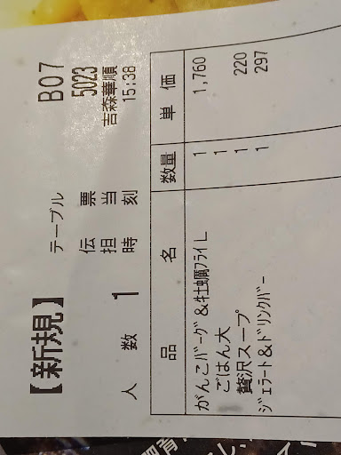 メニューはランチから がんこハンバーグランチにしました。 1280円×2 一人はスープをビスマルクスープにプラス180円 ドリンクバーにはジェラート付き280円×2 合計に税金かかります。