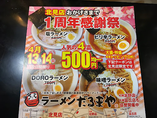 横浜市民であるわたくし、北海道では珍しい豚骨醤油というワードに惹かれたのと、だるまやさんが網走発祥のお店というので好きなラーメンをご当地チェーンでいただけるという最高のシチュエーションだったのでお邪魔させていただきました。
